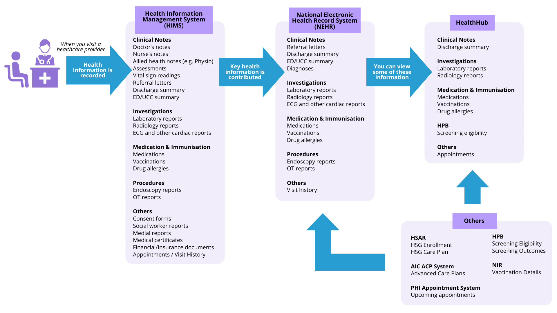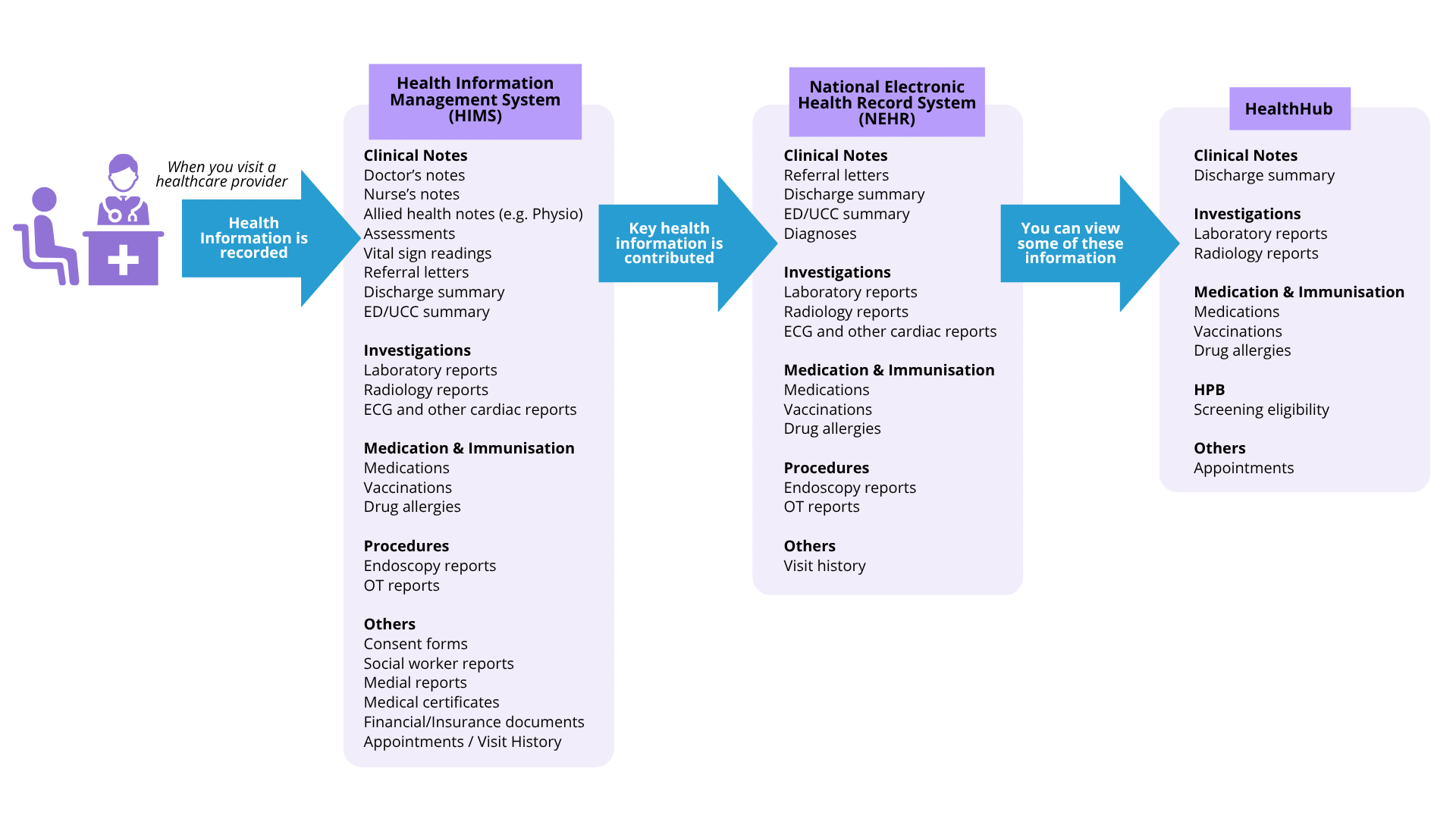 When you visit a healthcare service, health information generated during that visit will be recorded in their health record systems. Under the HIA, a subset of these information will be contributed and stored in the National Electronic Health Record system (NEHR).
